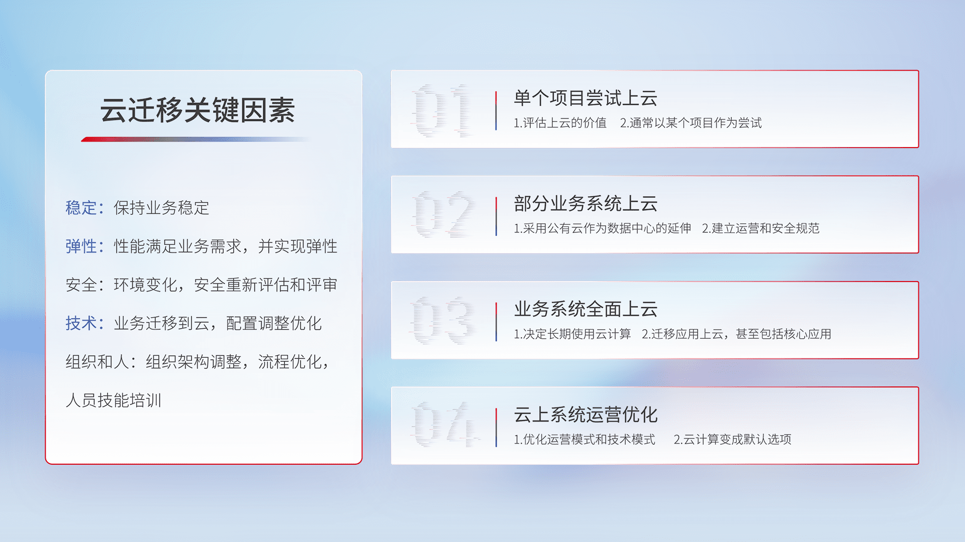 结合实际业务,,从规划设计、、、、云平台选型、、、云原生改造、、、数据迁移、、、、集成交付,,迁移全过程为客户识别最佳上云路径,,做好风险识别管理,,,设计网络架构、、、、身份权限、、安全审计合规、、、、操作审计、、、日志审计、、、监控告警策略、、、多站点容灾设计等,,,,对云上基础设施进行整体规划,,,,提升IT治理水平,,以满足弹性、、、、高可用、、高性能的需求。。