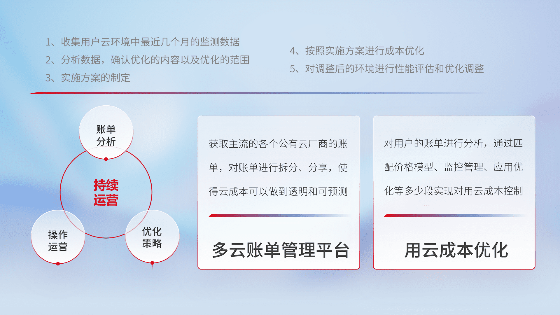 通过多云纳管,,,以统一的资源数据模型把客户的云资源进行抽象和封装,,进而实现对多云资源的统一操作,,,保障云资源管理的可靠性、、、、稳定性与可用性。。。量身定制化运维内容,,,配置、、、、开发运维、、、、补丁管理、、备份、、监控、、、、认证和访问管理、、、、审计和日常巡检等,,,保障在用云过程中的可靠度,,,稳定度以及高可用率。。