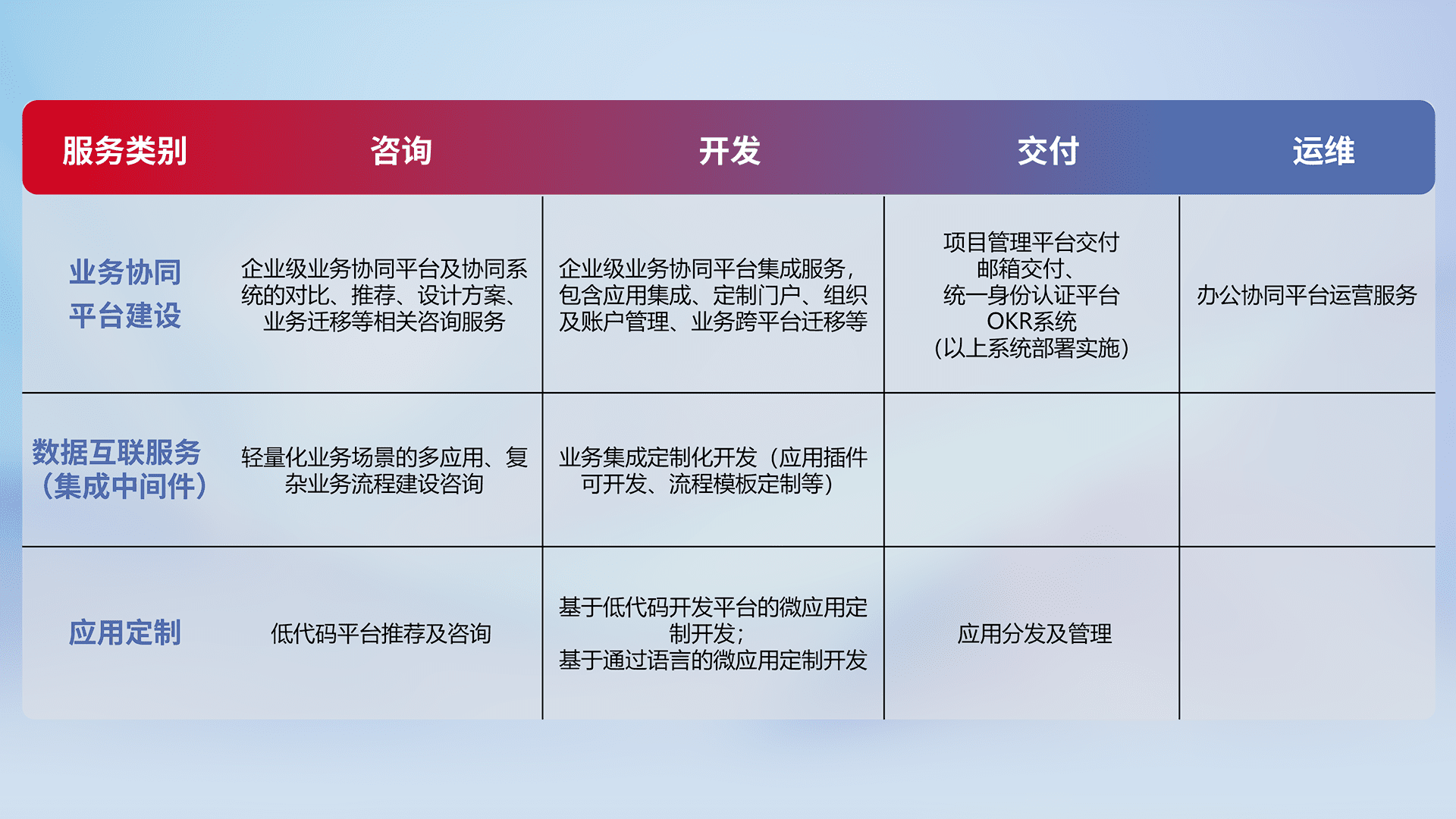 针对钉钉、、、、企微、、、IDaas等平台级产品提供产品的规划、、、、方案、、、、交付、、、、定制化开发等服务,,,实现如统一协同办公、、智能客户服务、、、混合会议管理、、智能数据查询、、、等业务场景,,,,实现数字化转型。。